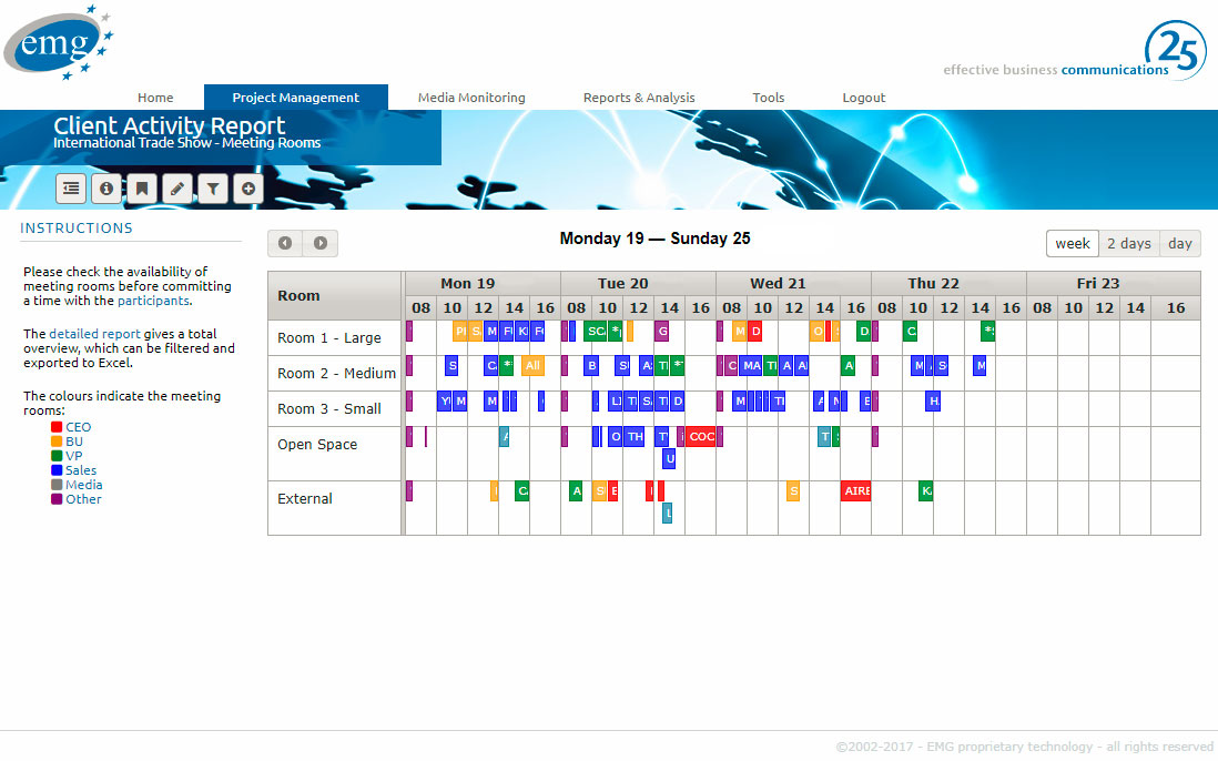 This is just one example of our practical approach to efficient conference and exhibition management. It’s based on our proprietary communications management system - the EMG Portal – which centralises a wide variety of marketing tools, from newsletters, VIP event RSVPs, analytical graphical dashboards, media reports & alerts, pipeline development, travel arrangements to… appointment scheduling & meeting room management. Always making sure that all team members have access to a unique set of information to avoid getting bogged down by outdated details and editing multiple versions of the same Excel document.